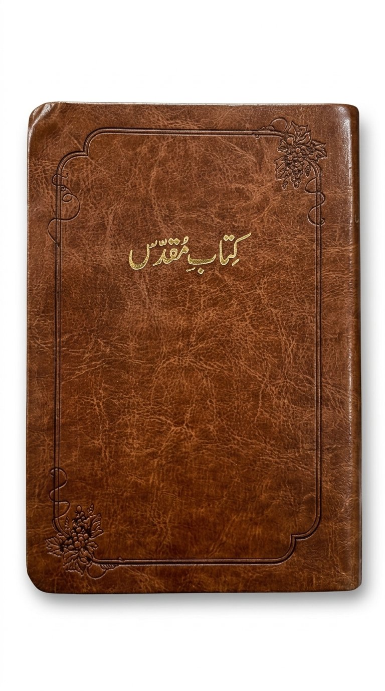 Premium Urdu Holy Bible (کتاب مقدس) with an elegant brown leather cover, featuring embossed floral design and golden title. Durable, stylish, and perfect for daily reading, gifting, and church use.